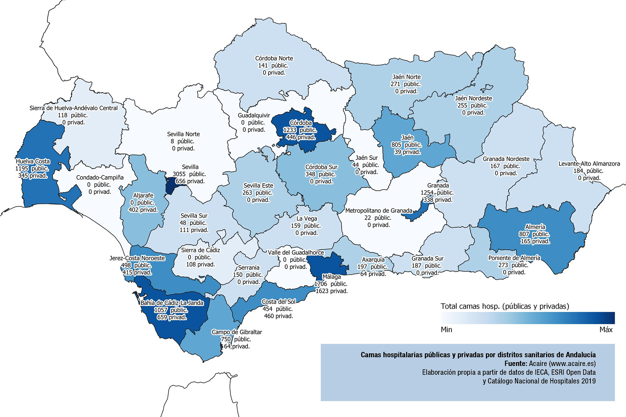 Calculamos el total de camas hospitalarias públicas y privadas por distritos sanitarios andaluces. El distrito que más camas dispone es el de Sevilla capital (3.711 camas), seguido del de Málaga capital (3.329), Bahía de Cádiz-La Janda (1.716), Córdoba capital (1.679), Granada capital (1.592) y Huelva Costa (1.540).