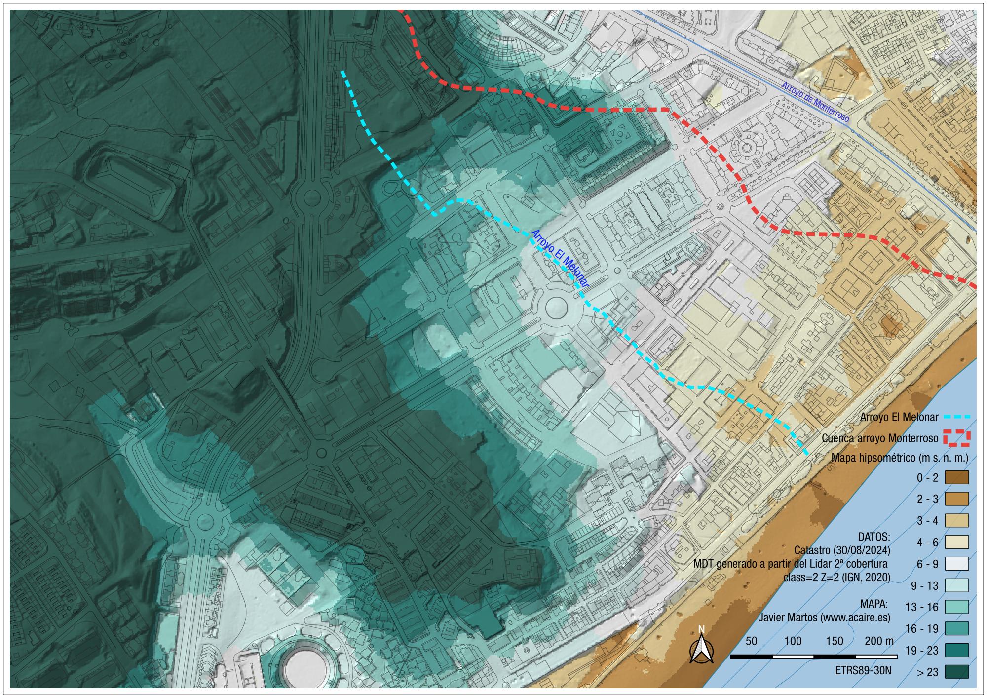 Al margen de otro estudio que pudiera valorar las posibles deficiencias de la red de pluviales del casco urbano de Estepona, para aportar algunas pistas al respecto de por qué hay zonas que tradicionalmente se inundan hemos realizado el mapa hipsométrico anterior, que clasifica por colores zonas con el mismo rango de altitud. Se ha superpuesto a este mapa el catastro actual para facilitar la identificación de barrios, calles y avenidas. El modelo digital del terreno se ha generado a partir de la nube de puntos LIDAR de 2ª generación disponible para descarga en la página del IGN.