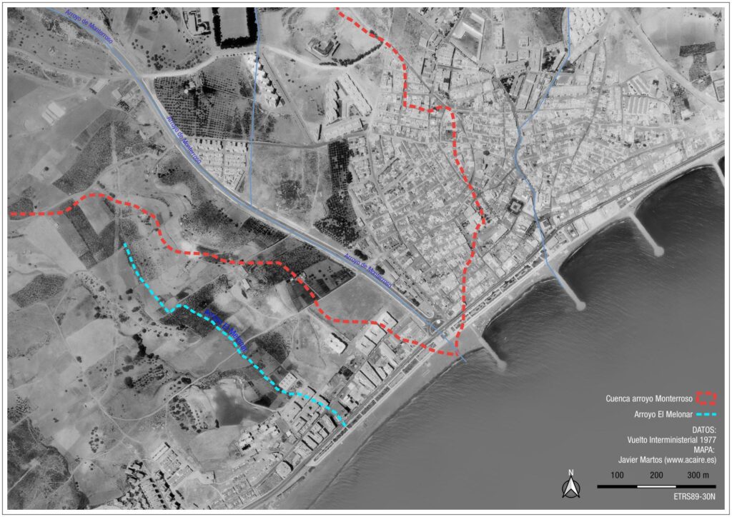 El mapa que encabeza esta publicación corresponde a la tercera de estas causas. La zona en rojo señala la cuenca del arroyo Monterroso, cuyo cauce divide en dos el casco urbano de Estepona. Otros dos ríos cercanos, al oeste el río Guadalobón y al este el río Padrón, vienen recogidos en los últimos estudios como áreas con riesgo potencial significativo de inundación (ARPSI). El arroyo Monterroso no.