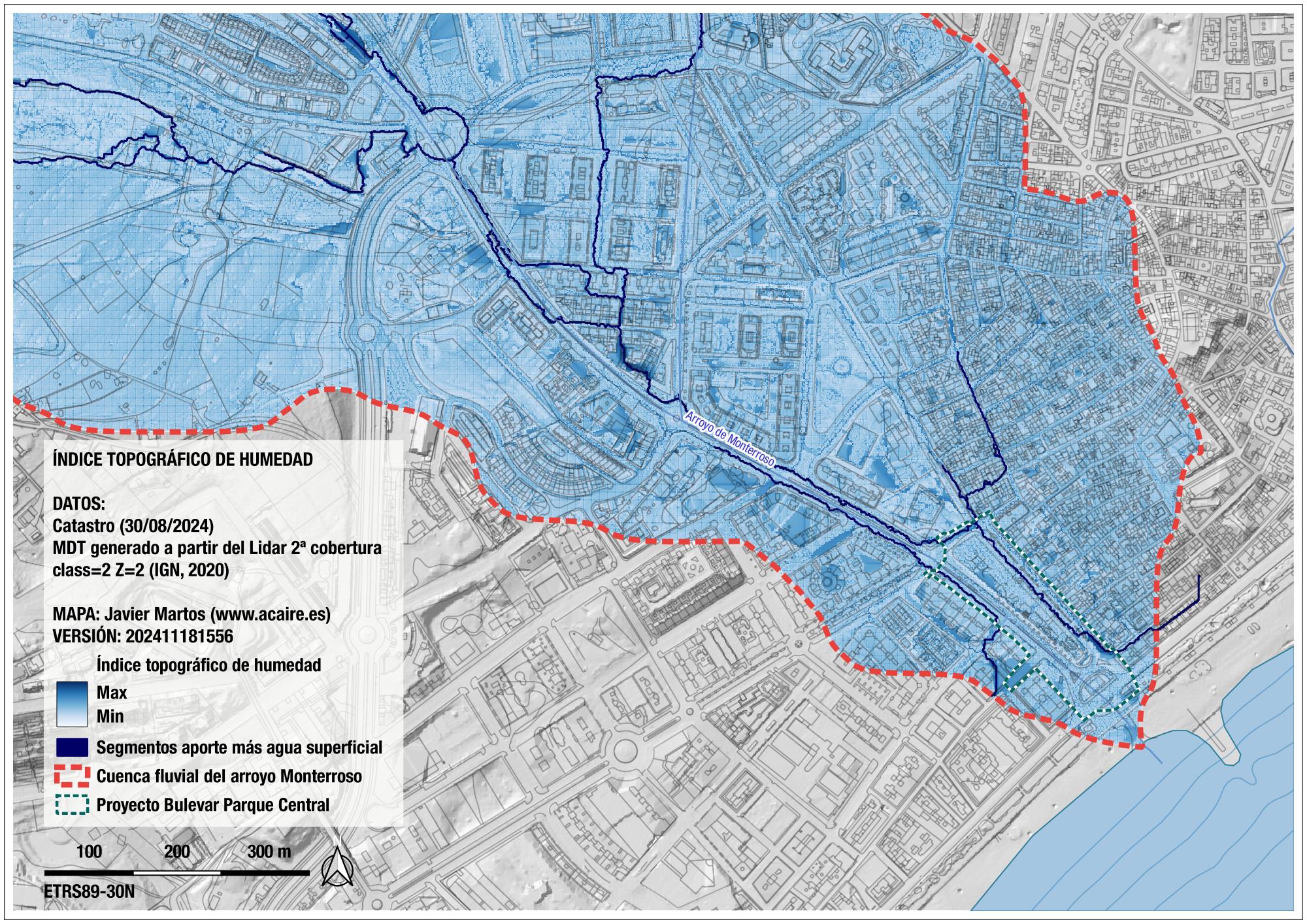 - Mapa de índice topográfico de humedad del curso bajo del arroyo Monterroso de Estepona